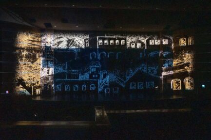 El diseño de proyección se inspiró en un poliedro digital, una estructura escultórica que se despliega lentamente, revelando facetas del universo surrealista de Varo. Este proceso se sincroniza con la dramaturgia de Ana Sofía Vázquez, que nos guía a través de un viaje entre los distintos cuadros de la artista, creando una experiencia multisensorial única.