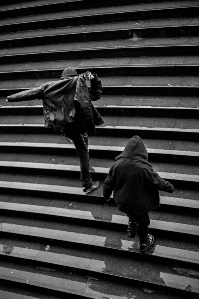 Poco a poco mientras todo aquello se diluía, me refugie de la lluvia y el viento, no era demasiado solo lo suficiente para que el azote regresara a la cabeza, una vez mas en rumbo había regresado a buscar brújula. Refugiado fuera del ventanal de la librería de la Opera de la Bastilla espere a que sucediera, ¿qué? no sé, pero tenia que pasar, y ahí en la inmovilidad de mi cuerpo y la velocidad de la imaginación apareció una atmósfera sonora que arremetía entre gritos y risas, bajo mis pies una banda llamada KermesZ había resistido a marcharse y había organizado un concierto intimo bajo esas escaleras, y yo, tratando de descubrir como habitaría el momento descubrí esa fantástica escena, ese campo de cosecha horizontal que daba frutos de rumbos e historias incógnitas, gente que emergía de ese campo geométrico y rompía el horizonte con su figura, en soledad, en compañía, con prisa o con frío, ese horizontal yermo enmarcaba historias, vidas de personas con un destino, el propio. Y ahí en medio de esa escena continué a integrarme a aquel concierto esperando la siguiente señal de dirección, el resto seria aprender de aquello que la vida me había regalado, de mantener los sentidos atentos que la dirección aparecerá de frente y sin prisa
